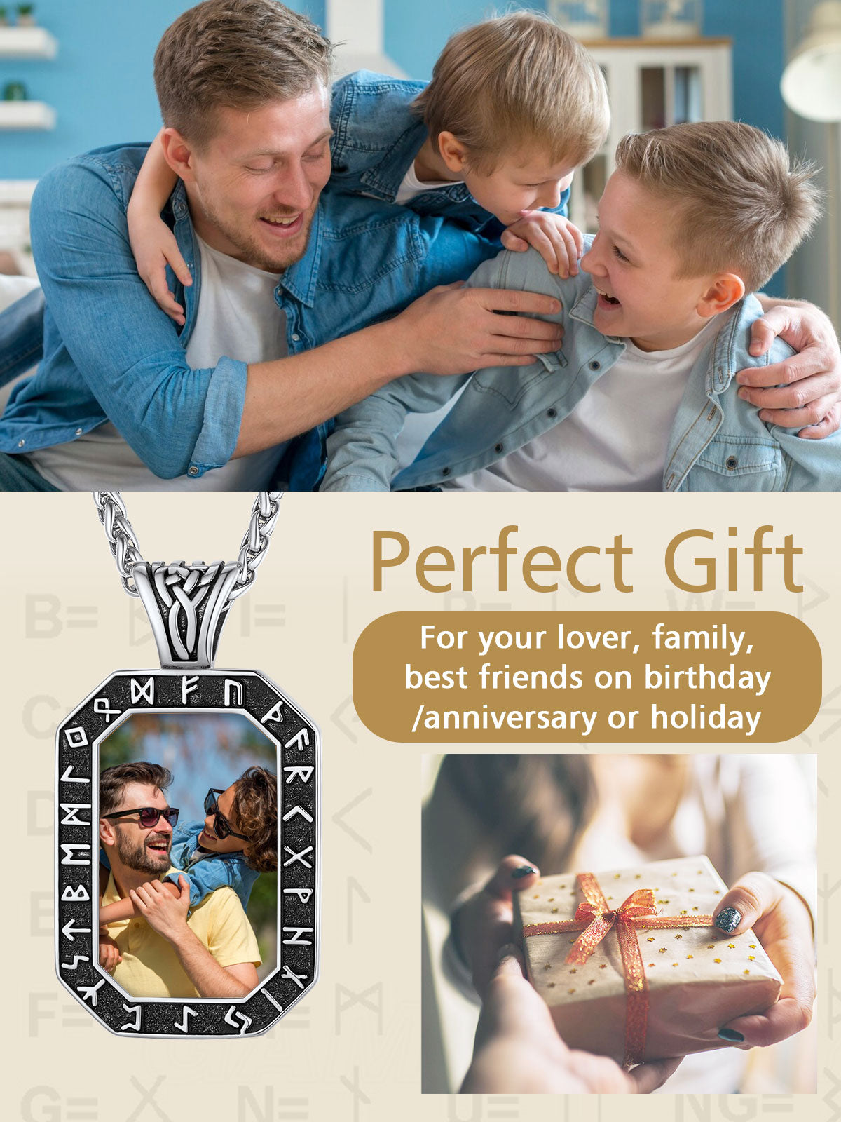 Diese personalisierte Halskette mit Foto-Hundemarke ist mit Wikinger-Runen verziert, die dem Träger Kraft und Schutz verleihen. Personalisierte Halskette mit Fotogravur und Runen, denen eine innewohnende Kraft zugeschrieben wird.