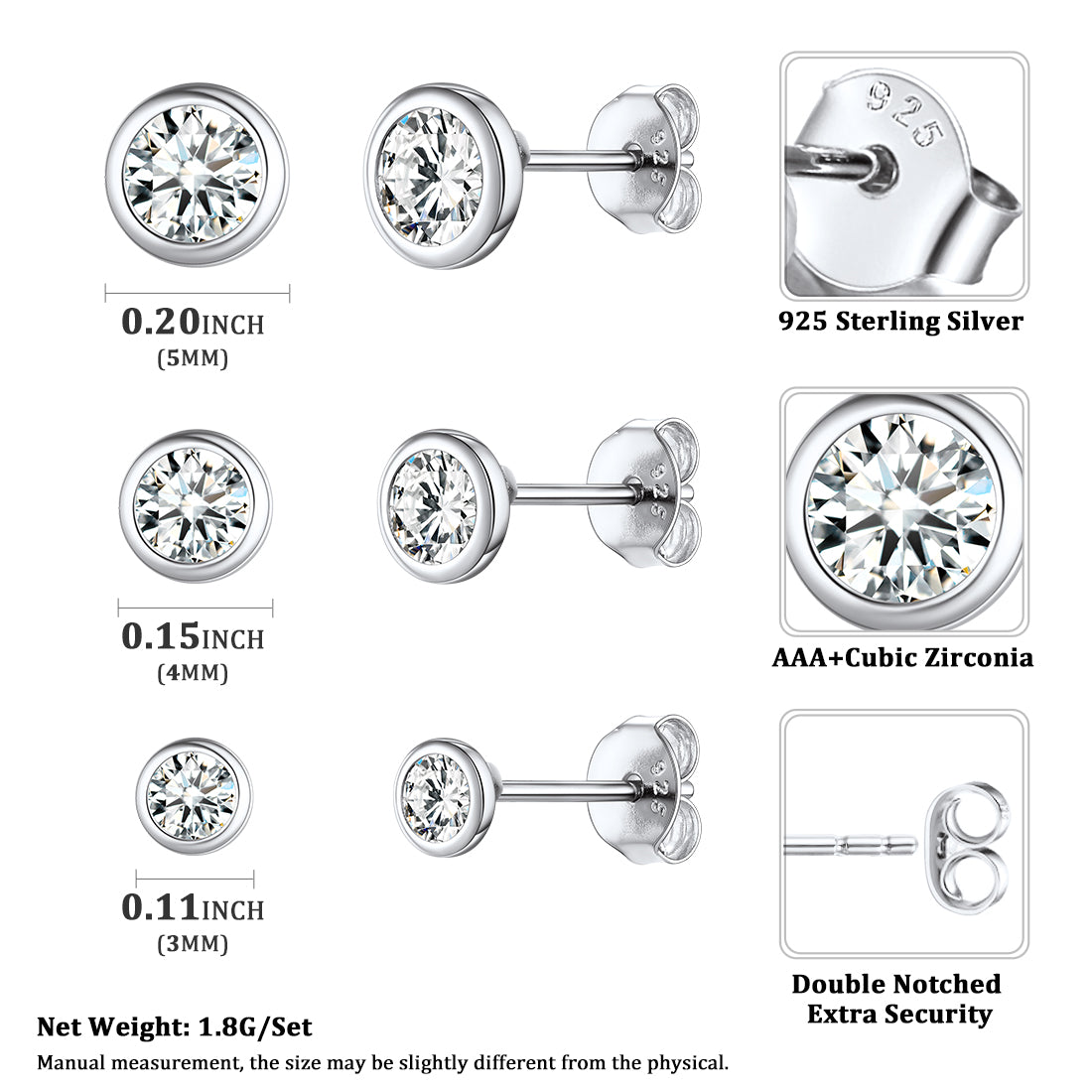 925 Sterling Silver CZ Stud Earrings Set for Men 3 Pairs