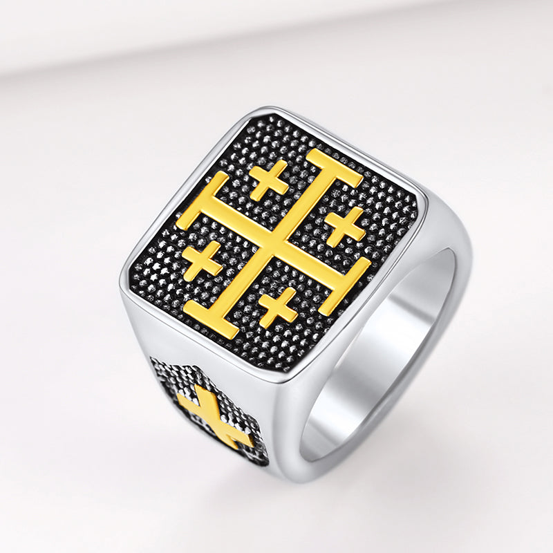 Handmade man statement ring designed with the heraldic five-fold Medieval Christian knights templar Jerusalem cross symbol. The Jerusalem Cross has been and remains to be a powerful symbol of the strong faith in Jesus Christ and Jerusalem.