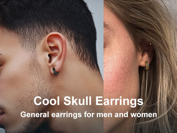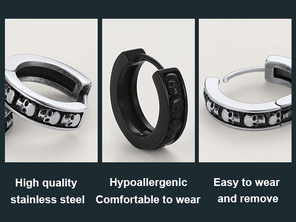 Minimalist gothic skull huggie hoop earrings for men, detailed skull heads design, always in fashion for classic one. Sleek hinged hoops are easy to open and close, do not need tools.